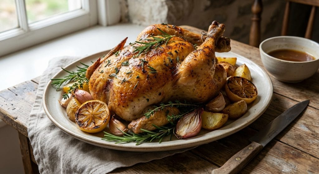 ローズマリーとタイムの香りが食欲をそそる、週末のディナーにぴったりのローストチキン。下味をつけてオーブンで焼くだけのシンプル調理ながら、食卓が一気に華やぎます。